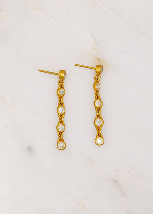 A pair of handcrafted chain drop earrings featuring antique old mine cut diamonds bezel set in 18k Fairmined yellow gold.