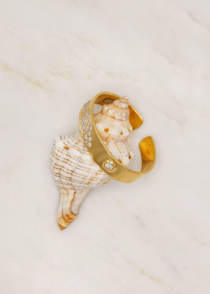 Bracelet handcrafted from solid 18k yellow gold featuring bezel set diamond and diamond cluster.