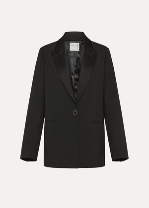 Crafted in Italy, this jacket brings a fresh twist to the classic tuxedo silhouette. Tailored from rich wool‐blend canvas with satin lapels, it channels evening polish with modern subtleties. The straight silhouette and clean line work echo Forte Forte's refined sensibility, giving you an elevated layer that transitions from formal to fashion-forward.