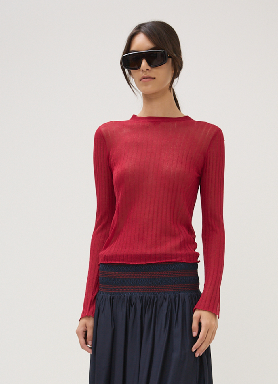 Lightweight and slightly sheer, the Dionne John Shirt is your new favorite not-so-basic basic. Designed in a deep crimson hue with subtle ribbing throughout, it’s cut slim with a simple crew neckline and long sleeves. Easy to tuck, layer, or wear on its own, it’s one of those pieces that quietly pulls everything together.
