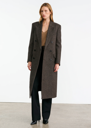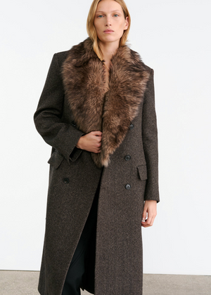 Oversized double-breasted coat in bark herringbone. Removable shearling collar. Fully lined with interior pocket and back vent.