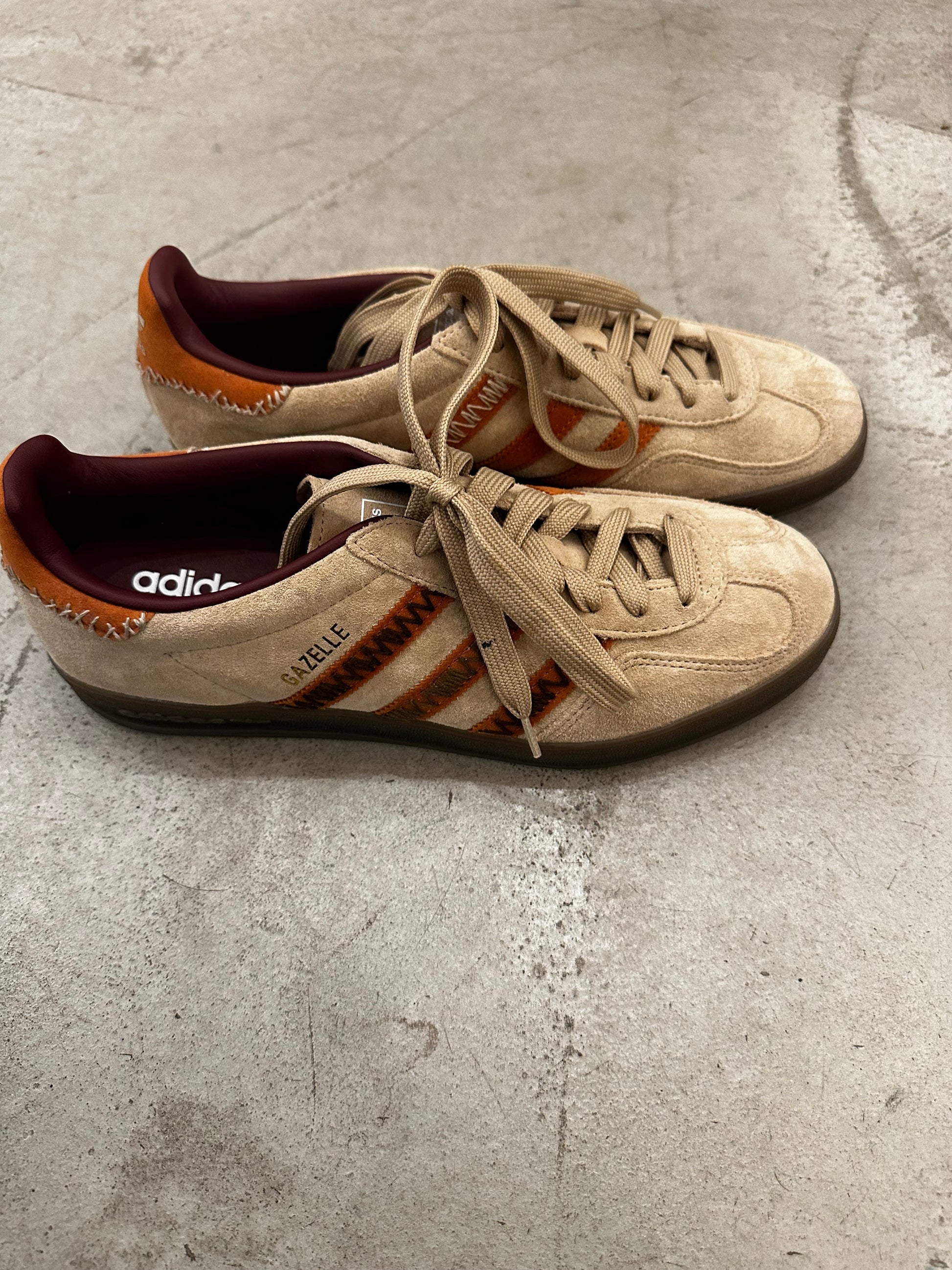 The iconic Adidas Gazelle gets a bold, artisanal twist. These sneakers have been transformed by Xelkom into a one-of-a-kind creation, featuring hand-embroidered details along the signature three stripes that infuse each pair with individuality and cultural storytelling. Featuring warm orange tones with rich tan suede for a look that’s equal parts street and craft. Contrasting heel stitching adds another layer of character, making these sneakers a true collector’s piece.