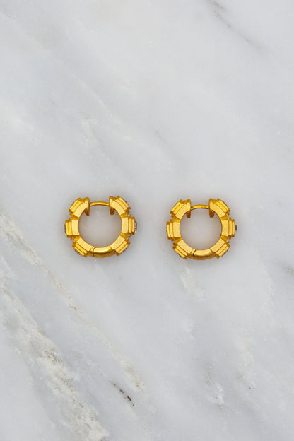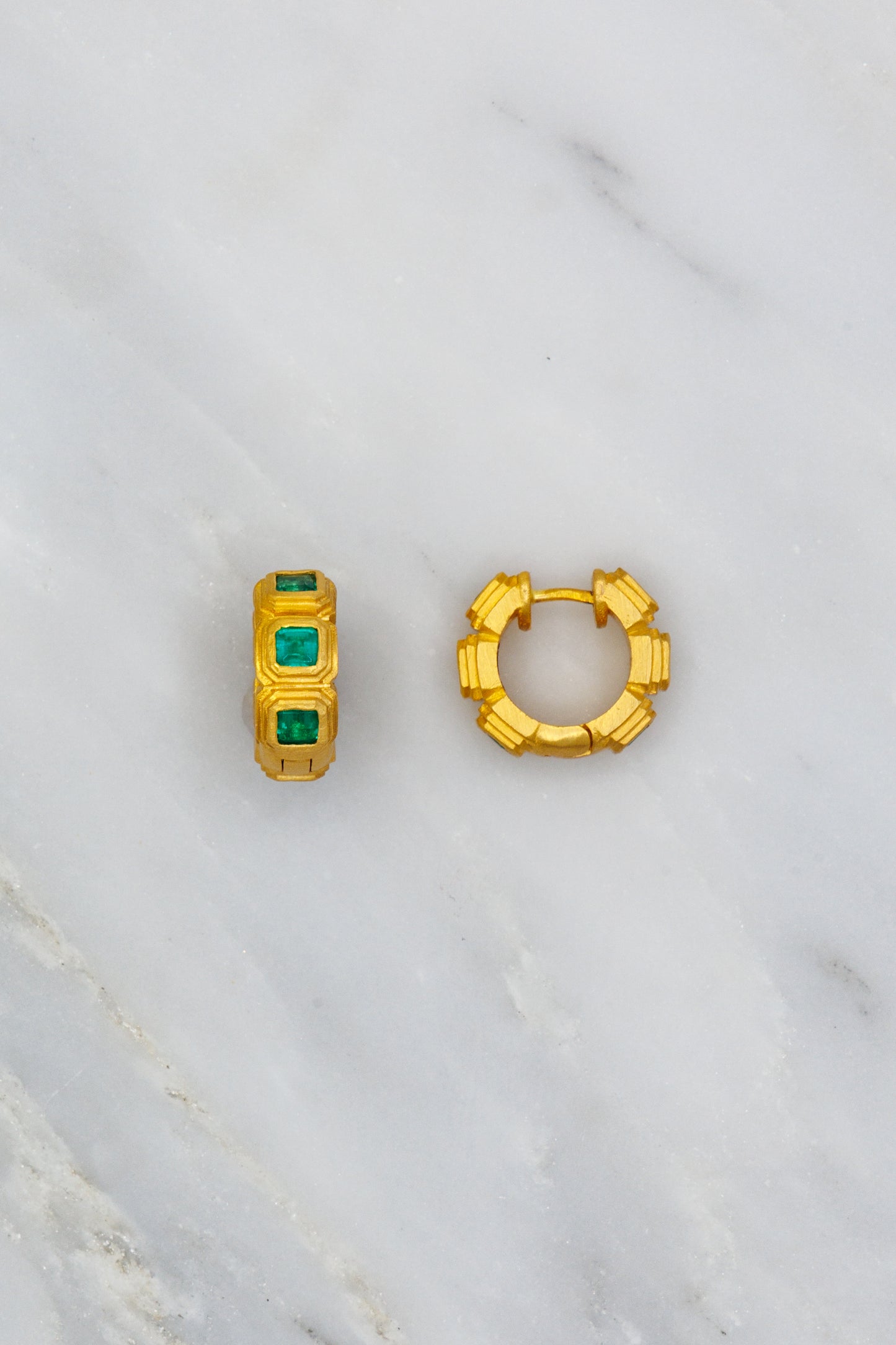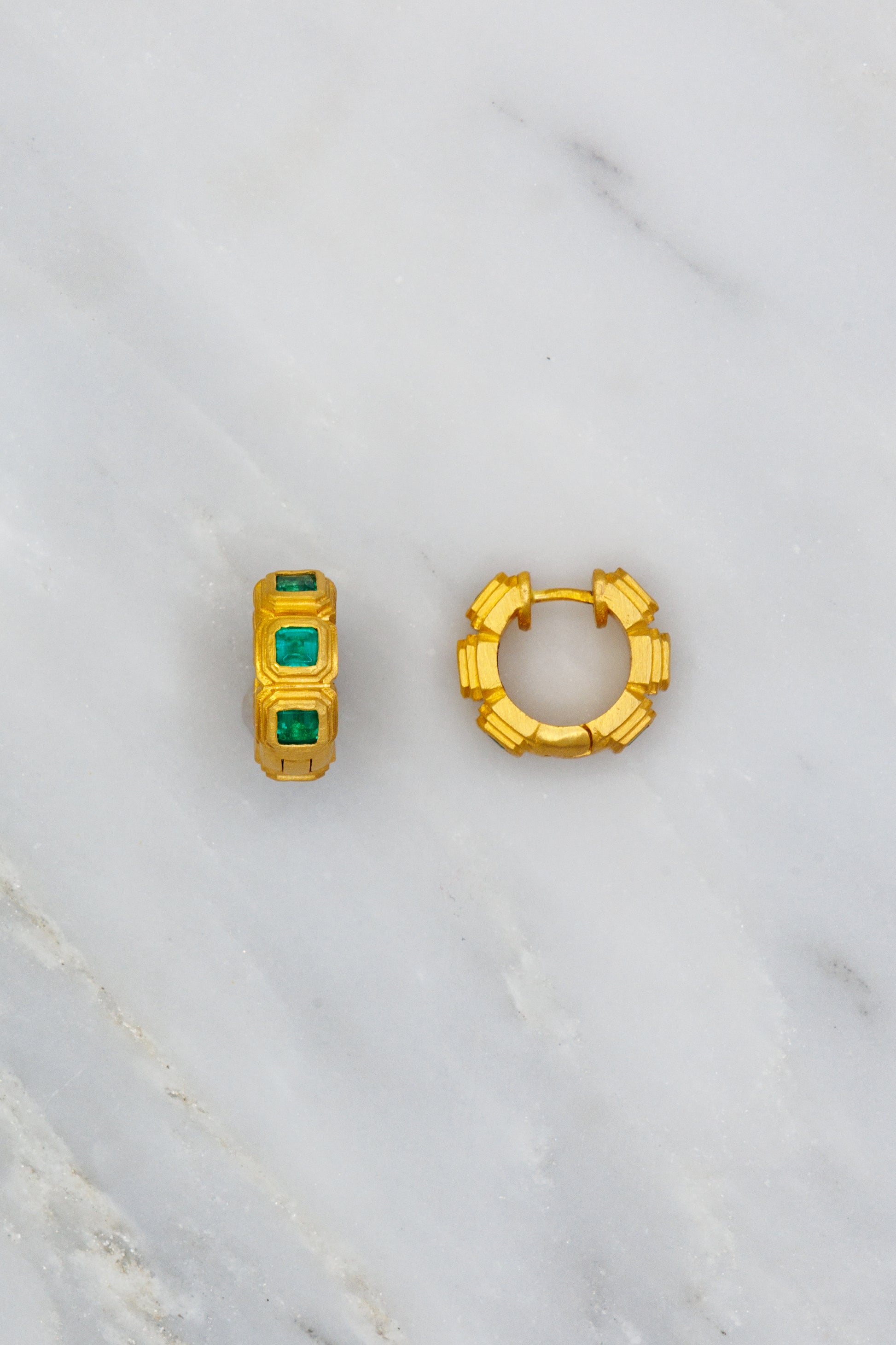 Hand crafted from solid 20k yellow gold with 24k matte gold dusting, the Emerald Ziggurat Hoops by Darius are a stunning celebration of geometric elegance and modern sophistication. Inspired by the intricate shapes of ancient architecture, these hoops feature a unique ziggurat design that combines bold lines with emerald embellishments, creating a striking contrast that draws the eye.