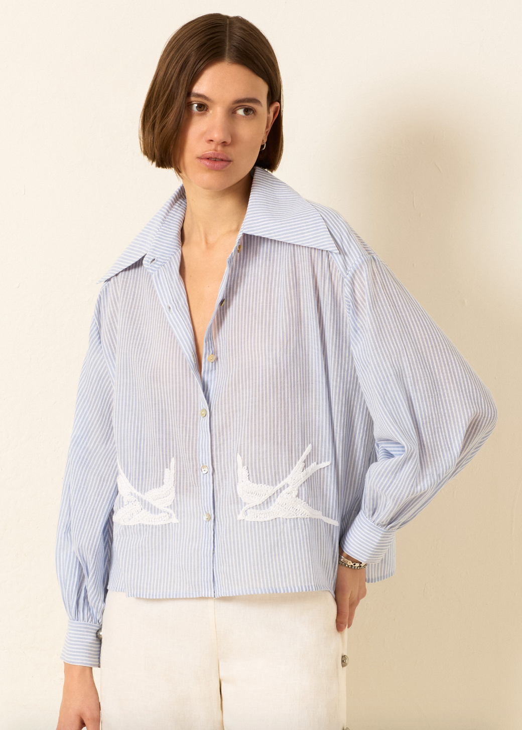 Individually cut by hand, the Emery Swallow Striped Cotton shirt has a '70s dagger collar and dramatically gathered sleeves. The vintage-inspired shirt is hand-embroidered with a pair of lucky swallows.