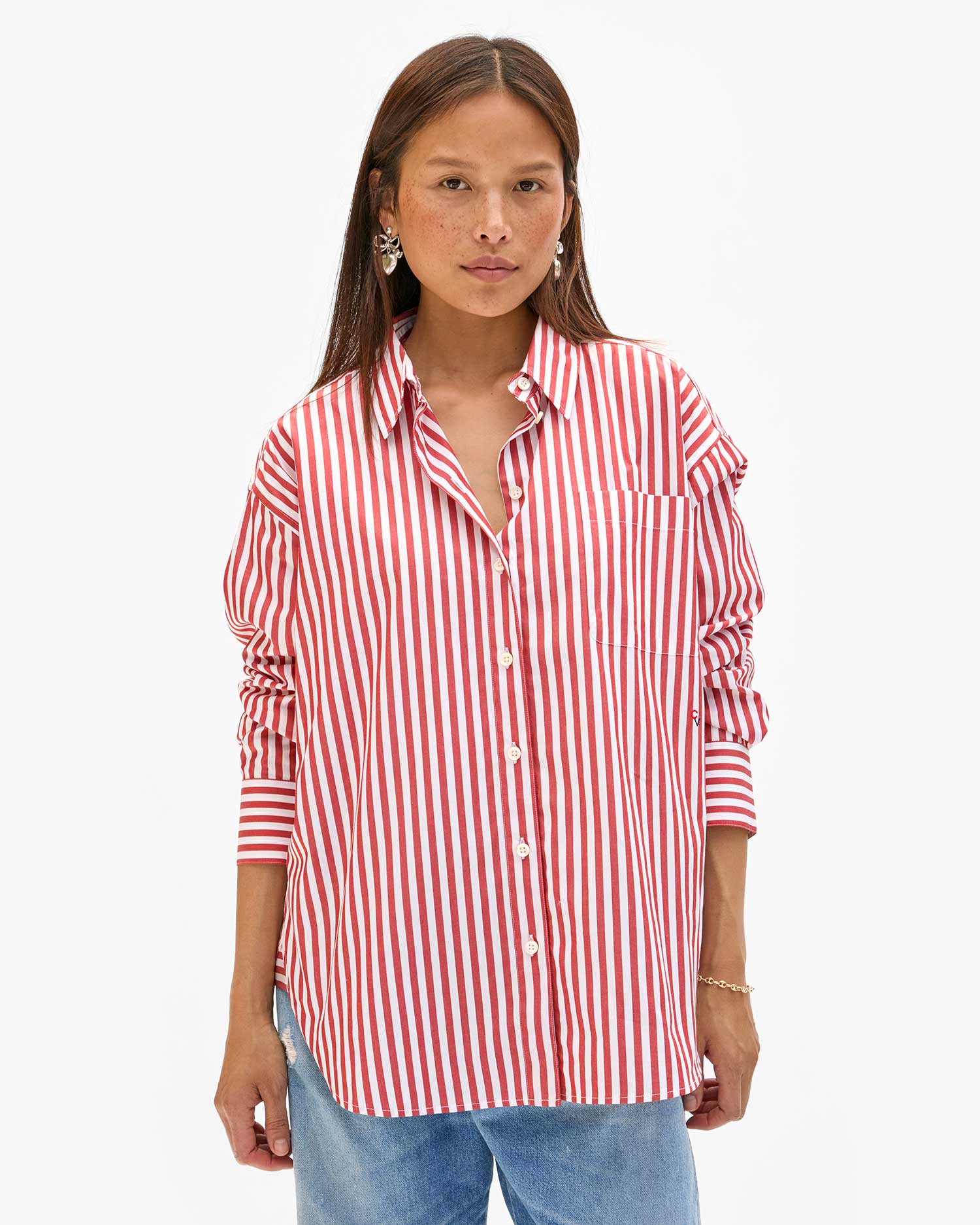 Made from crisp cotton and designed with dropped shoulders, button placket, and complete with single chest pocket and embroidered Clare V logo.