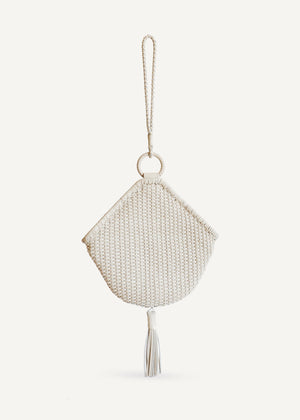 Handwoven in natural leather, the Esme Bag stands out with its sculptural diamond shape and braided wrist strap. Compact but full of personality, it fits the essentials - phone, card case, lip gloss - while adding texture and charm to even the simplest summer look. The tassel detail brings just enough movement to keep things interesting.