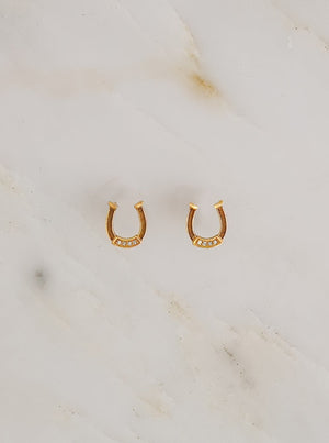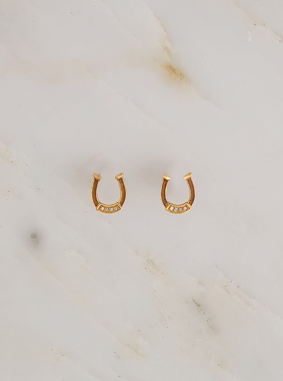 A pair of 18k yellow gold horseshoe studs with pave diamonds.