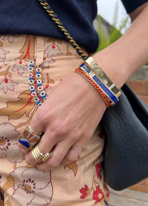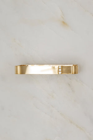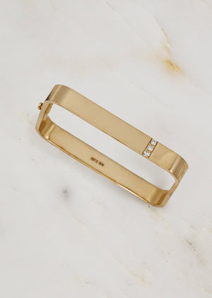 An everyday bangle crafted from polished 18k yellow gold and adorned with a vertical row of white diamonds. It's geometric silhouette is a sleek, modern twist on a traditional bangle. A perfect foundation piece for any bracelet stack, this bangle is bold enough to stand on it's own, but definitely plays well with others! Shown here with the Lockdown Square Bangle in Lapis and Grace Winfrey's Cabochon Coral Keeper Bangle.