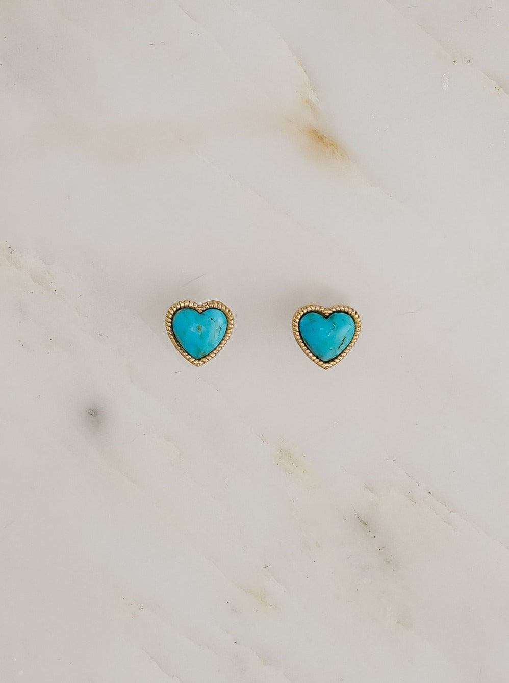 A pair of 18k yellow gold heart studs with turquoise inlay.