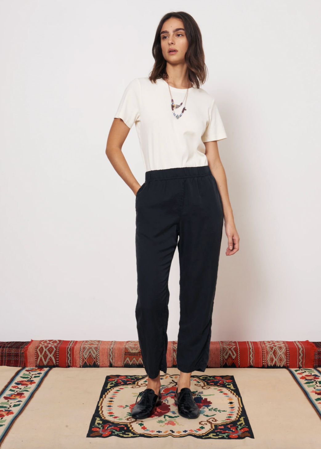 The ultimate lounge pant made from the sumptuous silk-cotton blend, designed with an elastic waistband and cropped silhouette. Complete with deep side slant pockets.