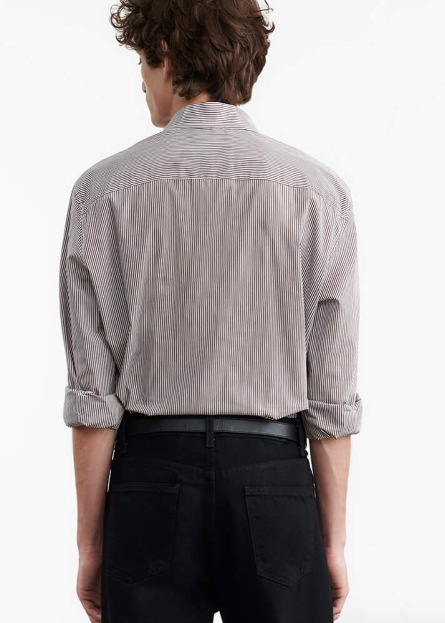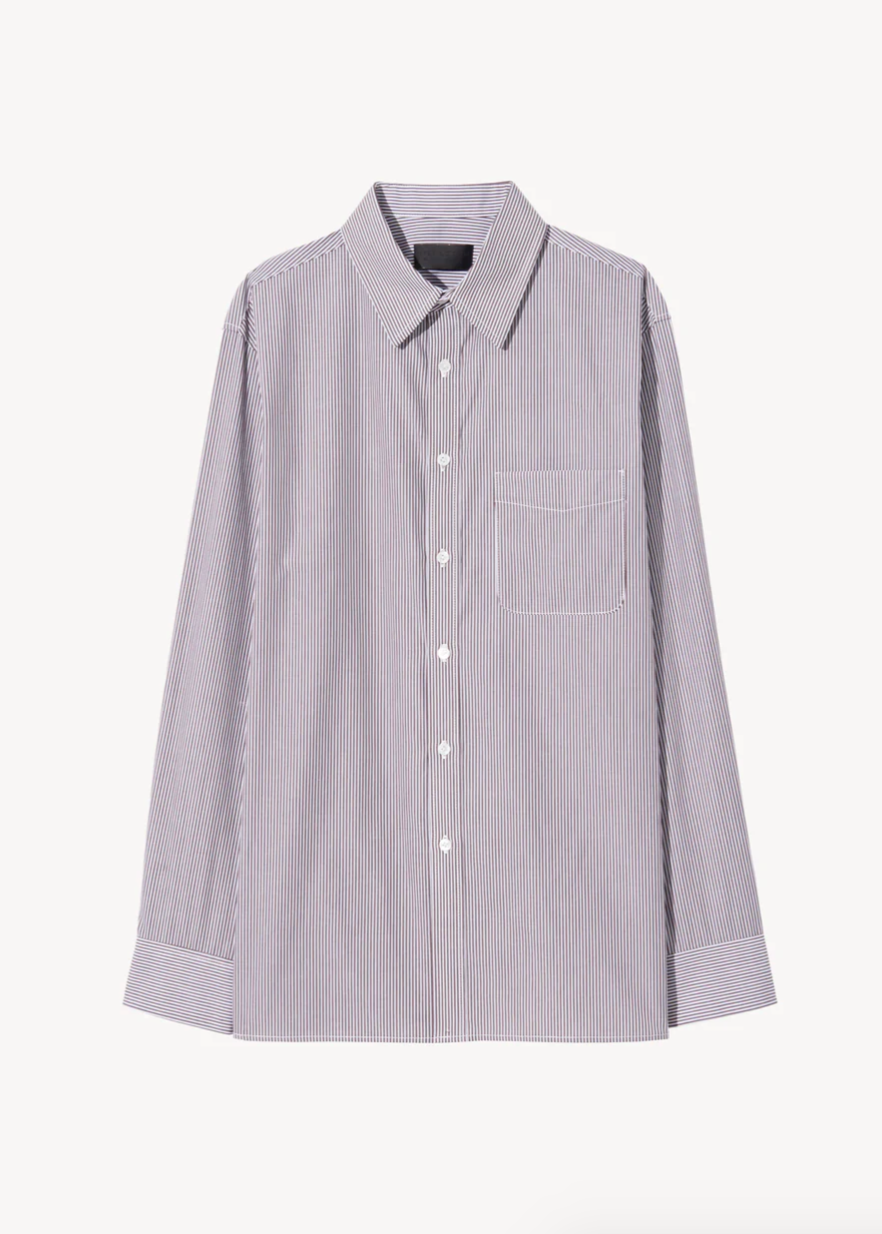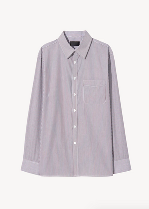 Relaxed fit Oxford button down shirt. Center front placket. Buttons at front and cuff. Single patch pocket. Structured collar emphasized by removable collar stays. Straight hem. Side slits. Box pleat at back yoke.