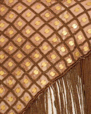 Hand-embellished with shimmering golden metal coins, our capelet features decadent beading and swishy fringe. Layer it over one of our slip dresses for a vintage-inspired look.