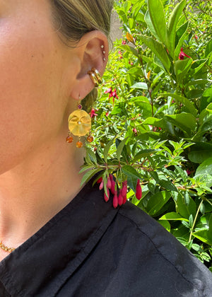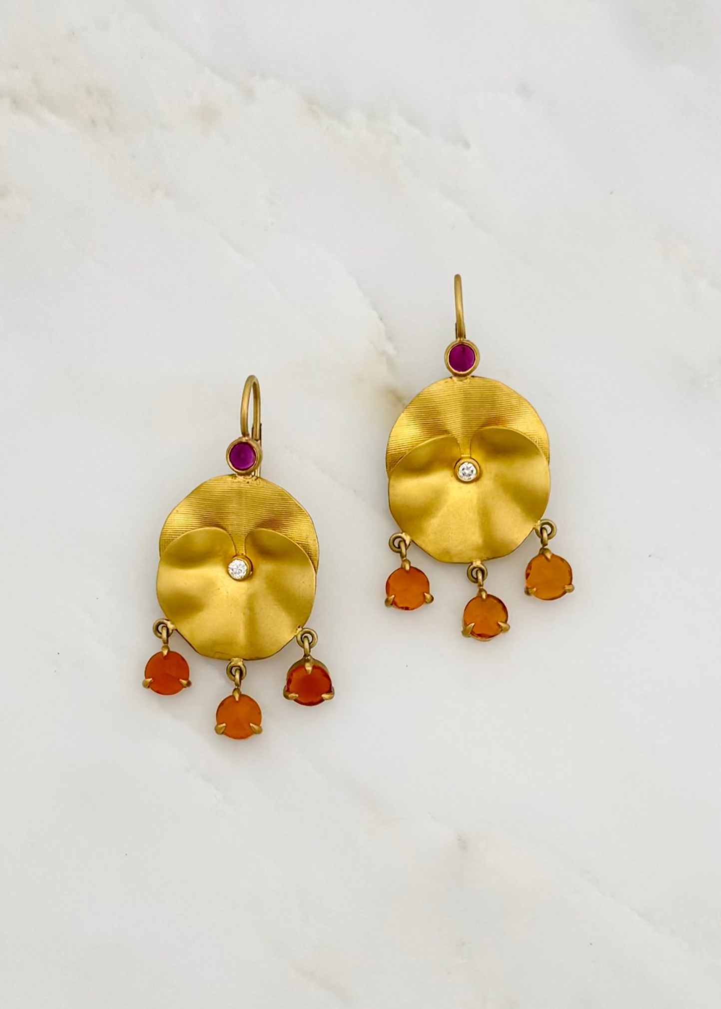 Handcrafted from 22k yellow gold and set with faceted fire opals, rubies and diamonds.Handmade in Santa Monica, California, by Cathy Waterman.