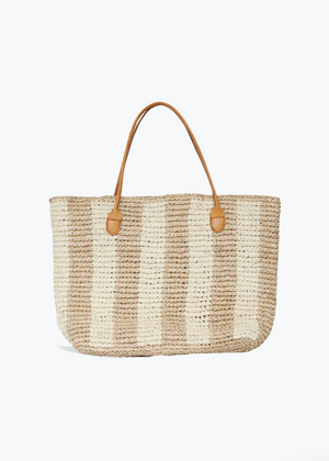 Handwoven from natural raffia with a stripe pattern, this chic tote as an open-top design ideal for warm-weather wanders, resort escapes, or daily errands.