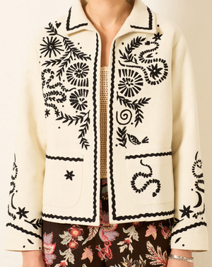 Cut from textured silk, the Francis Bone Snack Jacket in ivory silk is hand-embroidered with a contrasting flora and fauna motif. The hand-finished jacket features a cotton floral-print lining and cuts closer to the body like a blazer.