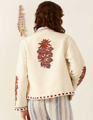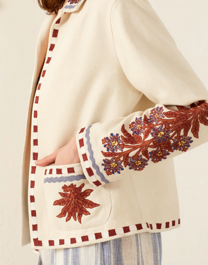 Crafted from slubbed silk, this ivory jacket is hand-embroidered with a symmetrical floral motif. The cotton-silk lined jacket has patch pockets and features our signature falling bloom, newly rendered with a waterlily motif.