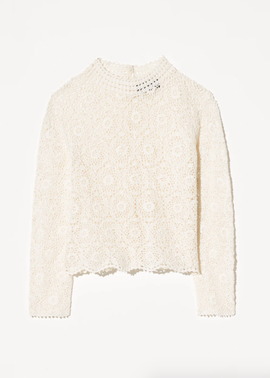 Handmade crochet button up top in Peruvian cotton. Custom circular floral crochet. Mock neck. Scallop detail. Bauble detail at hem. Buttons down the back.