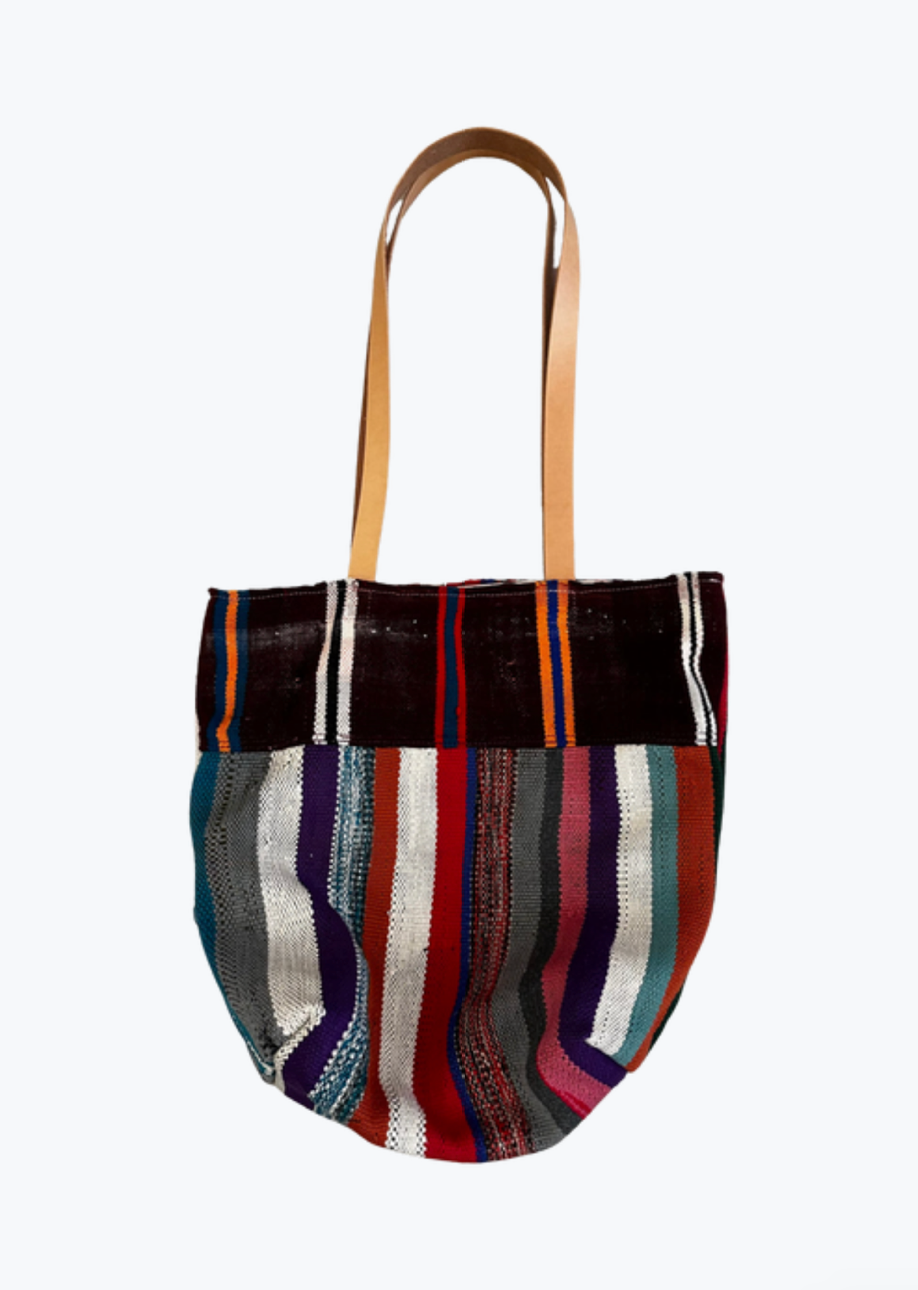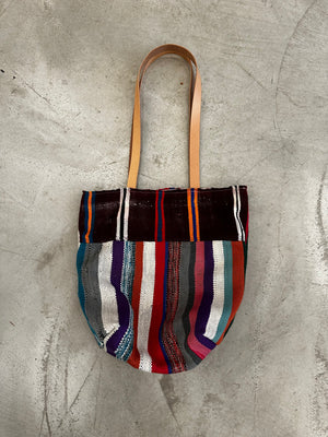 One of a kind tote bag made from antique and vintage Moroccan textiles, with leather handles. Handmade in California.