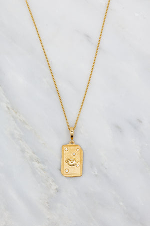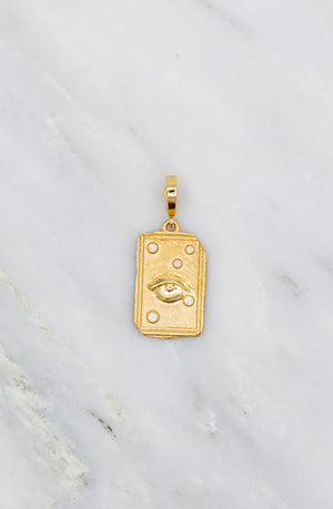 Inspired by ancient Greek sculpture, this pendant features a beautifully textured coin design with symbols that represent protection, awareness and intuition. A must-have for those who appreciate distinctive jewelry that tells a story. This coin comes on a charm clasp that opens and closes, and can be taken off or put on any chain. Made and hand-finished in LA, each Azlee piece helps ocean-related causes.