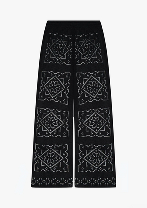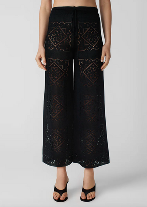 The ultimate feel-good pants. These wide leg pointelle knit pants are the definition of laid-back luxury. Their subtle handkerchief pattern is knitted in Calle del Mar's signature viscose yarn.