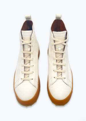 Shoto’s Melody high-top sneakers are crafted from supple leather, elevated by a bold gum sole for a cool contrast. The minimalist silhouette is refined with tonal laces and subtle stitching, while the textured outsole adds both grip and personality. Handmade in Italy, these sneakers bring artisanal craftsmanship to your daily rotation.