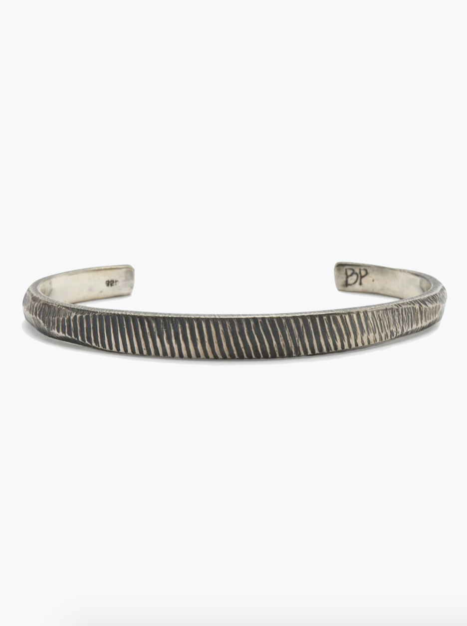 The Indo Maverick is rough and oxidized with precise details etched across the face of the sterling silver cuff. Its darker due to its light oxidation, which adds character and definition.