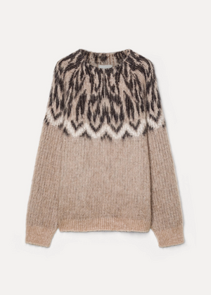 This round-neck sweater is knit in baby alpaca wool with intricate fair–isle patterning for depth and texture. The relaxed silhouette and subtle pattern make it effortless to style - tuck into skirts, pair with wide trousers, or layer under lighter coats. A quiet luxury essential made to elevate everyday.
