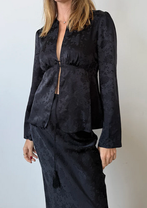 Made from luxurious printed black jacquard silk, the cap-sleeve Jorgina Top channels an easy blend of relaxed polish and late-night edge. It features a flattering waist seam that subtly defines your silhouette and a charming lace-trimmed Peter Pan collar for a touch of whimsy and vintage flair.
