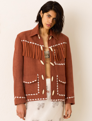 Cut from a lightweight linen, this Western-inspired jacket is hand-embroidered with a shell motif and buttons with toggle fasteners. The hand-finished jacket is lined in a cotton-silk blend.