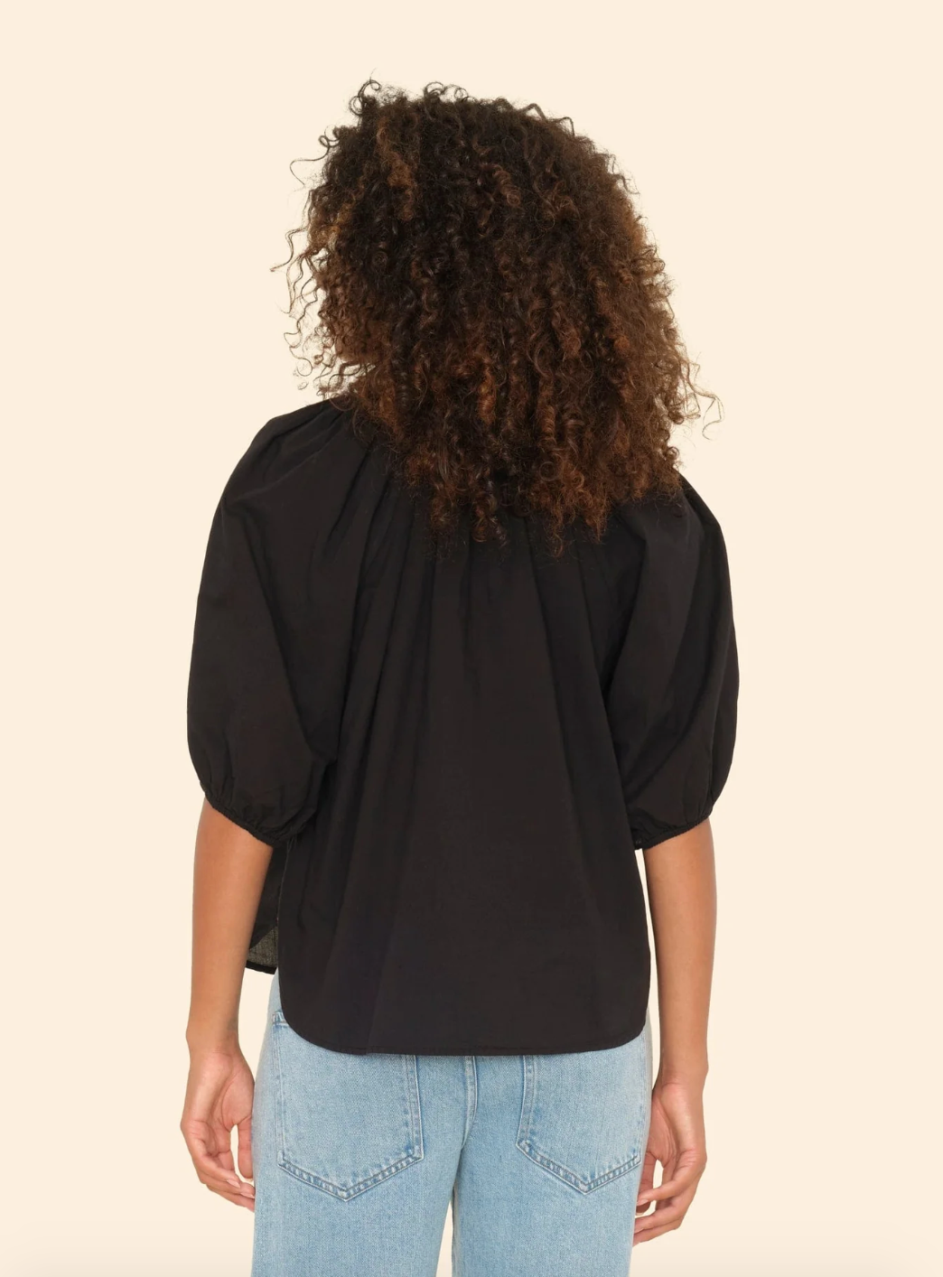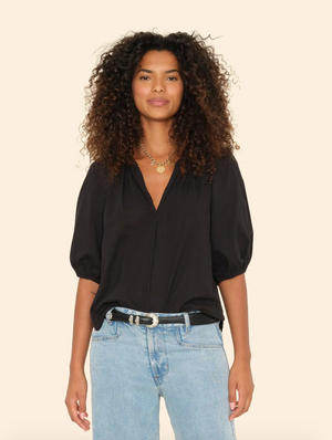 Made in lightweight woven cotton poplin for a lived-in look and feel,Jules isan easy popover with a ruffle neckline and bubble sleeves with an elastic cuff.