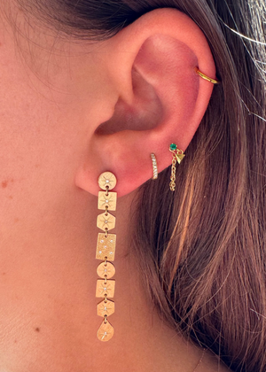Gold with attitude, shine with movement. These 14k yellow gold earrings combine mixed charms and shapes with sprinkles of white diamonds that catch the light with every turn. Their design balances bold sparkle with artisanal detail.