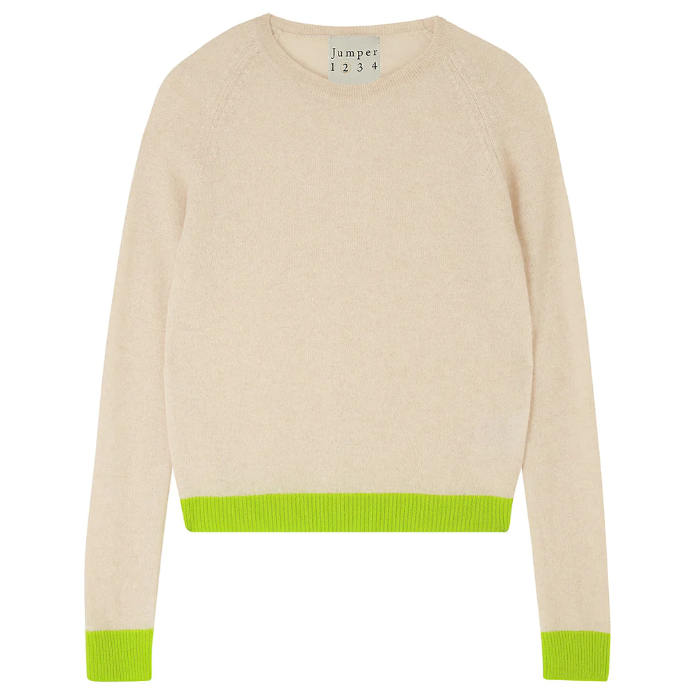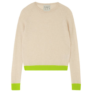 Lightweight cashmere crew neck jumper with contrast acid green ribs.