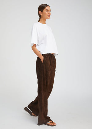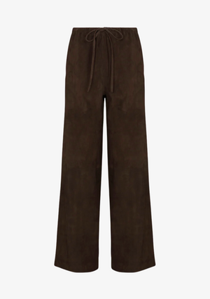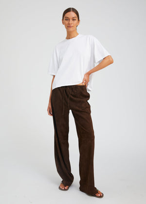Relaxed luxury, perfected. The Kauai Pant is crafted from buttery-soft suede in SABLYN’s signature Americano brown. Designed with a fluid wide-leg silhouette and an adjustable drawstring waist, this pant balances laid-back comfort with refined polish. Subtle side pockets add function without disrupting the clean lines, while the supple suede drape moves beautifully with every step.