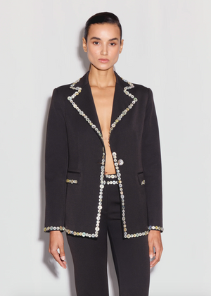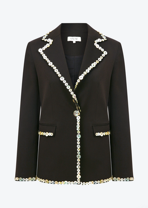The Lexa Jacket is a tailored blazer jacket in dark brown, accented with shell buttons and intricate trim detailing. Crafted from a structured fabric with just enough stretch, it offers a sharp, form-enhancing fit through the shoulders and waist.