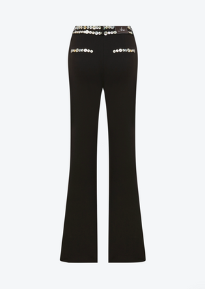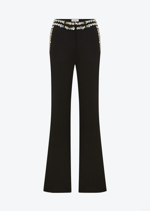 The Lexa Pants are straight leg tailored pants in dark brown, finished with shell button accents at the waistband. They sit high on the waist and fall cleanly through the leg, creating a lengthened silhouette. The fit blends precise tailoring with comfort, making them an ideal match for the coordinating blazer or a simple, refined top.