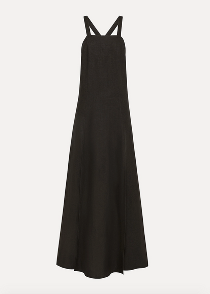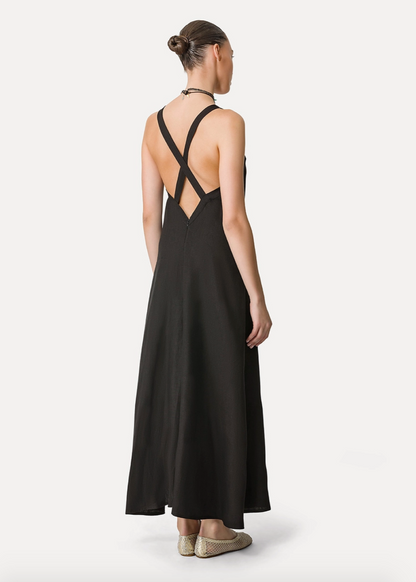 Dress with spaghetti straps that crisscross at the back. Made in a fluid linen that skims the body and falls to a fully flared shape while the double split front.