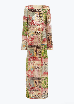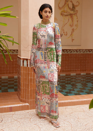 This is the kind of dress that does the work for you. Covered in fine printed sequins, the surface catches light with every step. The silhouette stays clean and streamlined, letting the texture be the star. It skims the body without feeling restrictive, striking that balance between polish and ease. Designed for nights that call for something memorable, not predictable.