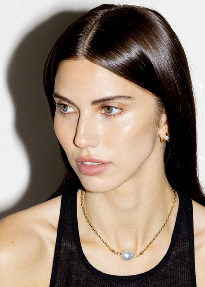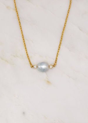 Handcrafted from 25.5g of 18k yellow gold, this necklace showcases a baroque light blue-white South Sea pearl suspended by 18k yellow gold bolts that enable the pearl to rotate effortlessly. Complete with Uniform Object's signature gold spur and push clasp closure.