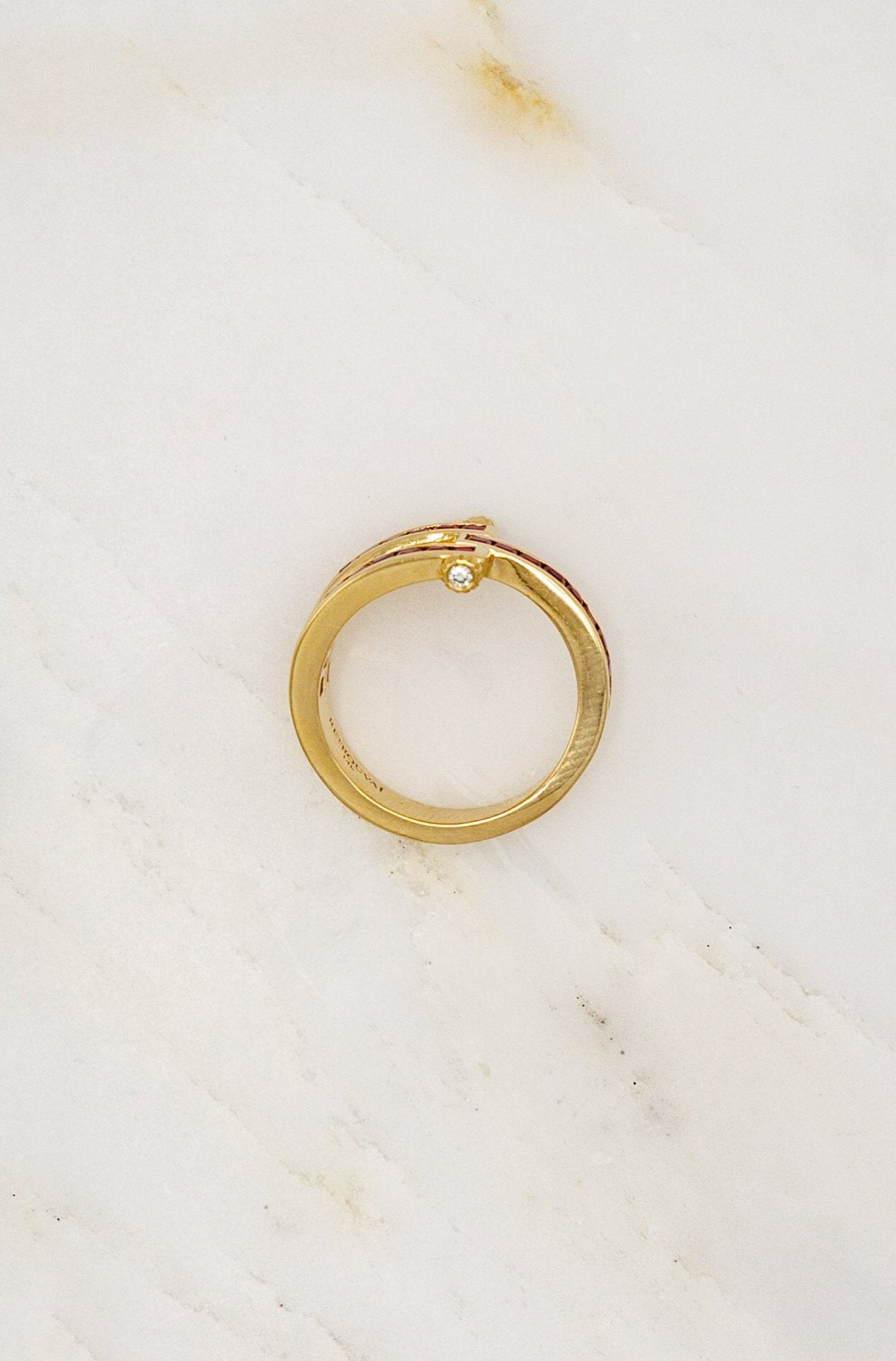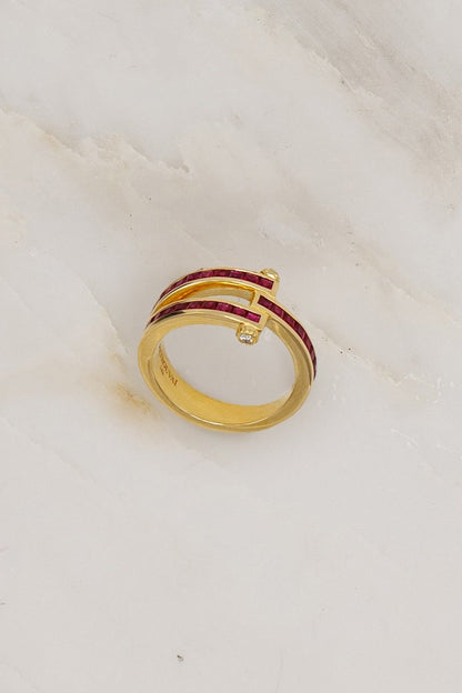 The Retrouvaí Magna Ring is a stunning example of fine craftsmanship, featuring a striking design of interlocking bands made from 14k yellow gold, showcasing a series of princess-cut rubies accented with white round brilliant diamond knobs. The essence of the Magna collection is inner strength and connectedness.