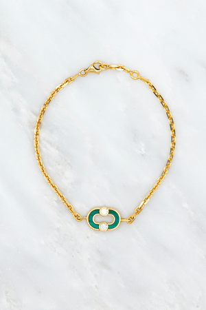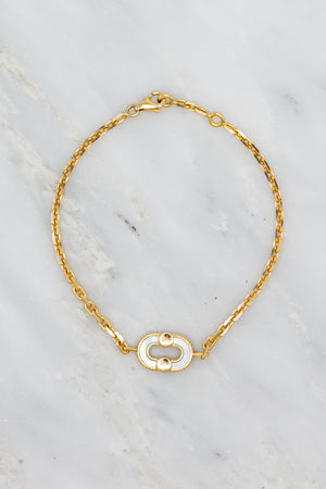 Crafted in 18k yellow gold, this chain bracelet is anchored by a double-sided magnet charm with one side featuring a striking carved lapis inlay accented by white diamonds; the reverse featuring two Mother of Pearl inlays. Each piece of Viltier's Magnetic Collection is built around a bold, circular motif - two halves meeting in perfect balance - symbolizing the invisible pull between people, places, and moments that belong together.