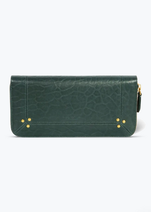 Crafted in supple lamb leather, this zip-around wallet features a wrap around zip closure, a central zip coin pocket, 15 card slots, multiple bill compartments, and plenty of space for IDs or receipts.