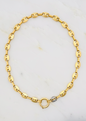 A bold reinterpretation of a total classic. TheMariner Knife Edge Link Chain by Circa 1700 is crafted in solid yellow gold with sleek beveled links. Finished with a signature pavé diamond accent link and circular clasp, this chain balances sculptural weight with refined style. Worn solo or layered, it anchors any look with strength and elegance.