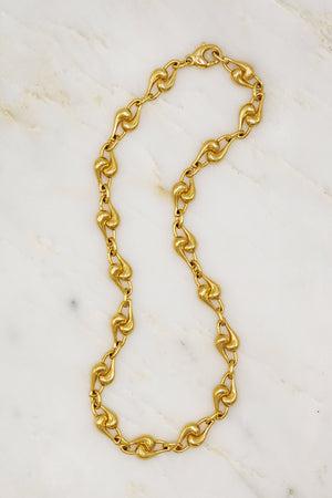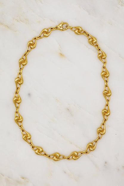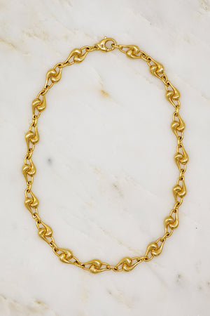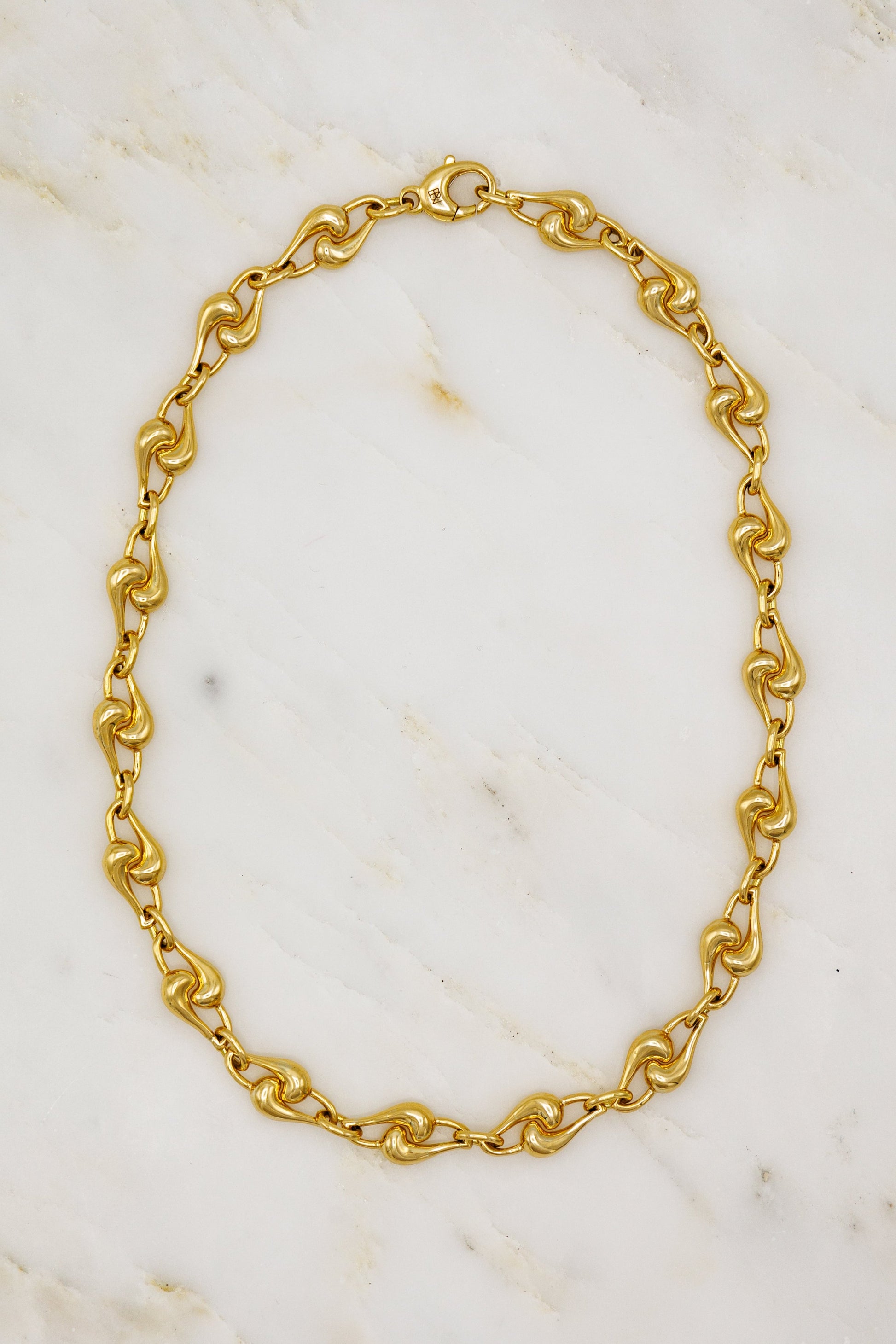 Crafted from 18k yellow gold with a polished finish, Brent Neale's Medium Knot Chain necklace blends classic craftsmanship with a contemporary twist. This necklace features a series of medium-sized, interlocking knot links, each meticulously shaped to create a smooth, flowing silhouette. The unique knot design adds an element of texture and visual interest, making it a standout piece that’s both elegant and versatile. The chain has a luxurious weight that feels substantial yet comfortable for all-day wear.