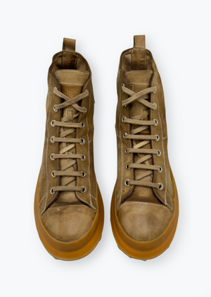 Shoto’s Melody high-top sneakers are crafted from super soft sueded leather, each pair carries subtle variations in tone and texture for a one-of-a-kind patina. Elevated by a bold gum sole for a cool contrast, the minimalist silhouette is refined with tonal laces and subtle stitching, while the textured outsole adds both grip and personality. Handmade in Italy, these sneakers bring artisanal craftsmanship to your daily rotation.