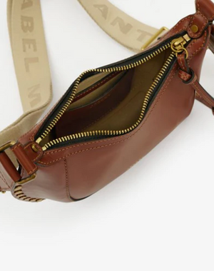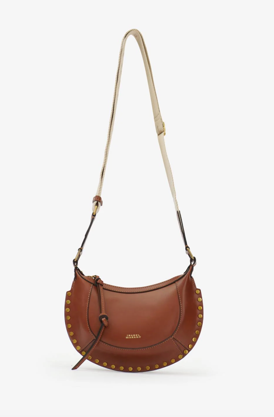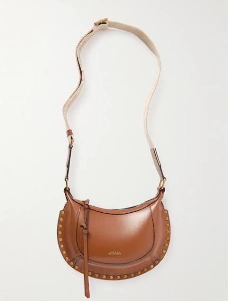 Cognac calf leather studded shoulder baguette bag with adjustable cotton strap. Hand carry, shoulder carry and cross-body carry options.