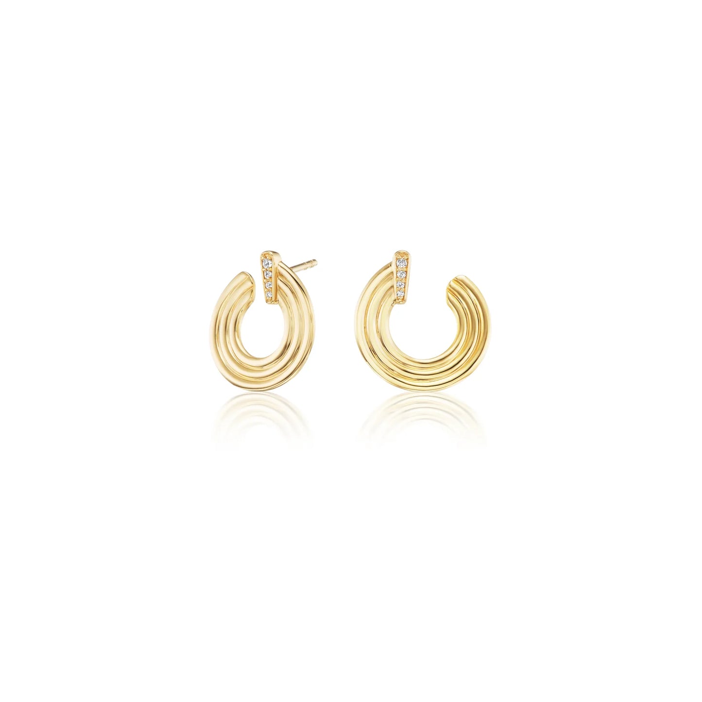 Handcrafted 18k yellow gold crescent earrings with 0.04 total carat weight (cttw) G-H/SI diamonds. 16 mm.