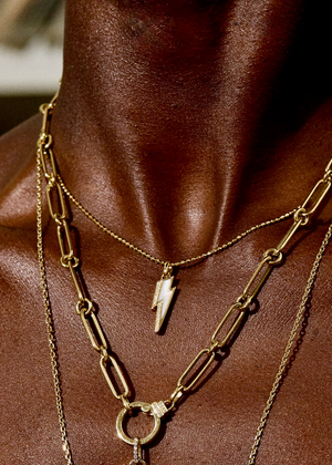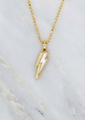 A bold and playful piece that adds a spark of energy to any look. Featuring a sleek lightning bolt design, this petite pendant brings a modern edge with its sharp lines and polished finish. Crafted from 18k yellow gold and adorned with diamonds and Mother of Pearl inlay, this pendant is perfect for those who love a touch of rock-and-roll flair in their jewelry. Its compact size and distinctive design make it an everyday statement piece, combining Sorellina’s signature mix of sophistication and fun.
