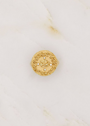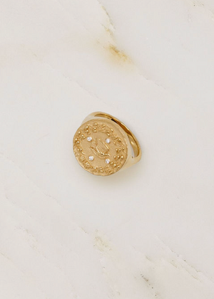 Made from solid 18k yellow gold, this signet ring features an ancient Greek dove surrounded by bountiful ancient grains celebrating our Mother, Mother Nature. Four diamond accents in the North East South West.