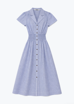 this striped button-front midi dress is tailored with a softly structured collar and button front. Smocking at the shoulders and waist creates subtle texture and a flattering, cinched silhouette before falling into an easy A-line skirt.