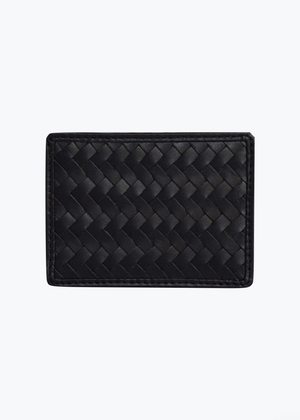 A slim, minimalist card case to hold your essentials. Made in handwoven leather and features two card slots and a pocket for loose bills.